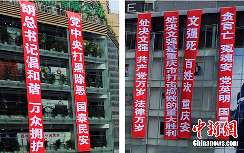 重庆渝中区最繁华的解放碑商圈两商场挂出条幅,庆贺文强被执行死刑。中新社发 郭晋嘉 摄