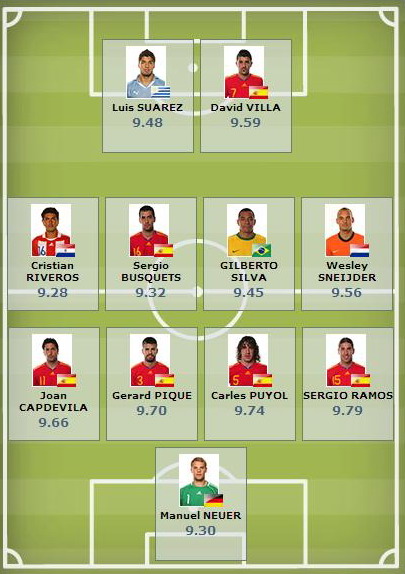 本期国际足联数据榜最佳阵容为:门将:诺伊尔(德国,9.30分);后卫拉莫斯(西班牙,9.79分)、普约尔(西班牙,9.74分)、皮克(西班牙,9.70分)、卡普德维拉(西班牙,9.66分);中场斯内德(荷兰,9.56分)、吉尔伯托-席尔瓦(巴西,9.45分)、布斯克茨(西班牙,9.32分)、里维罗斯(巴拉圭,9.28分);前锋比利亚(西班牙,9.59分)、苏亚雷斯(乌拉圭,9.48分)。
