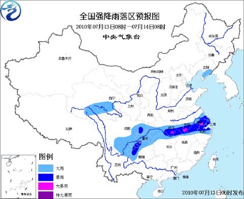 预计,7月13日08时到7月14日08时,四川南部和东部、重庆大部、贵州西部和北部、湖南北部、湖北中南部和东部、安徽南部、江苏南部、江西东北部、浙江北部等地有大到暴雨,其中,湖北南部、安徽西南部和江苏南部等地的局部有大暴雨;辽宁东南部、云南东北部、青海南部等地的部分地区有大雨、局地暴雨。上述局部地区并伴有短时雷雨大风等强对流天气。