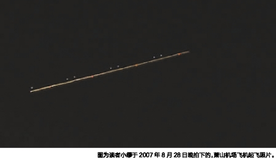 图为读者小缪于2007年8月28日晚拍下的,萧山机场飞机起飞照片。