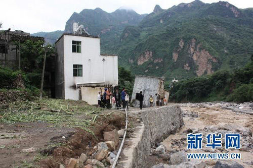 7月13日,云南昭通市巧家县小河镇村民站在受损的房屋外。新华社发