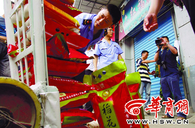 工商人员将疑似有问题的“五常香米”暂扣(图片来源:华商网)