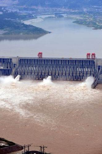 7月17日下午,三峡大坝开启4个泄洪深孔和1个排漂孔,将出库流量由32000立方米/秒增大到34000立方米/秒以下泄洪水。新华社发(郑家裕 摄)