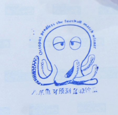 西班牙队夺冠的当天上午,开园后该馆前的大屏幕上就打出巨大广告,一条粉红色的可爱章鱼,圆溜溜的眼睛瞪着脚边的一个足球,并打出一排字幕:“首盖章鱼幸运章”。这枚幸运章上的章鱼形态十分可爱有趣,光光的脑袋,圆圆的眼睛,一副“张牙舞爪”的样子,一经推出就受到热捧,它也充当了国际信息发展网馆的代言人。