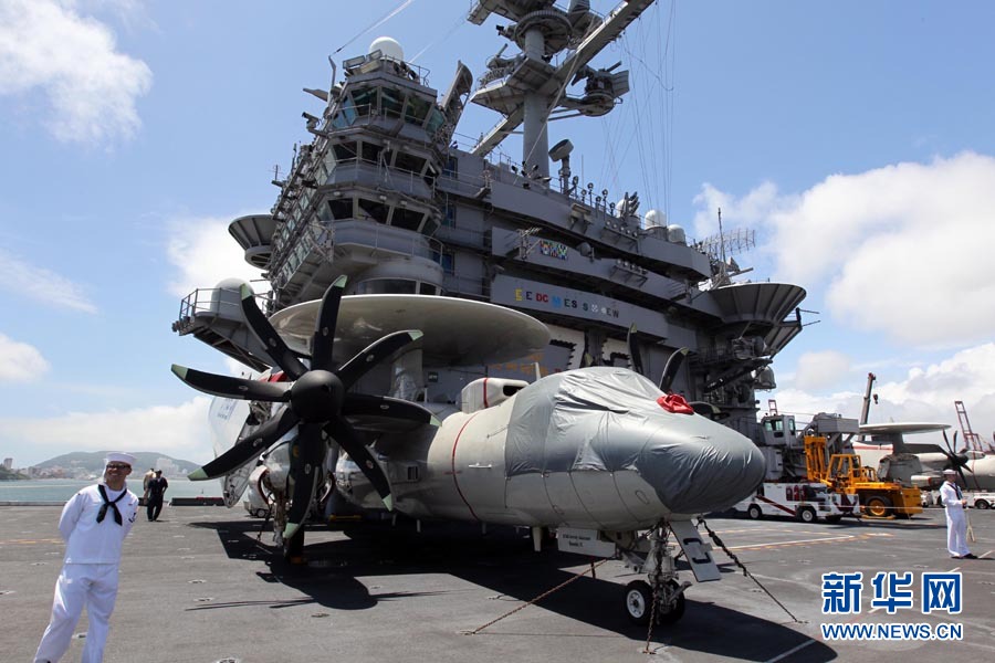 7月21日,在韩国釜山港的美国海军“乔治·华盛顿”号航空母舰上,一名美军士兵站在一架美军舰载预警机旁。当日,美国第七舰队航空母舰“乔治·华盛顿”号抵达韩国釜山港,准备参加从25日开始的韩美联合军演。 新华社/联合通讯社