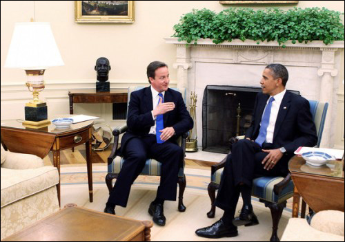 为消除外界对双边关系不如以往的猜测,两位领导人在记者会上重申了两国之间的亲密关系。按卡梅伦的说法,两国关系已经从“特殊”升级为“必不可少”。会谈前,奥巴马还让卡梅伦参观了自己的白宫官邸,他女儿房间的整洁给卡梅伦对留下了深刻的印象。卡梅伦说,以后他也要这样教育自己的孩子,奥巴马则幽默地回应称,这其实不难。卡梅伦在会谈之后的联合记者会上表示,如果美国总统能让他的小孩把房间整理得那么整齐,英国首相也不能落后。而奥巴马未等卡梅伦说完就插话说:“你一定能够做到,很简单,只要给他们一些提示,如此而已。”卡梅伦赶紧请教要给些什么样的提示,奥巴马则不慌不忙地说,“你只要告诉她们,今天英国首相会来参观你们的房间”。说完,卡梅伦和现场记者笑得前仰后合。