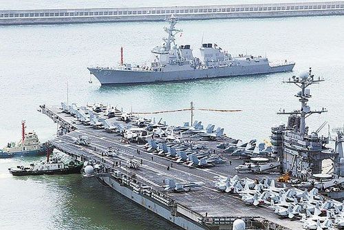 停靠入釜山军港的美军华盛顿号航母战斗群