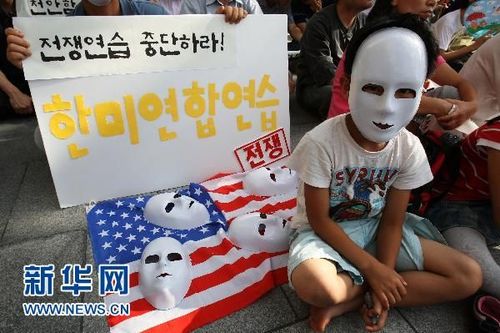 7月25日,在韩国首都首尔的美国驻韩国大使馆附近,一名少年参加反对韩美联合军演的集会(标语文字:中断战争演习)。