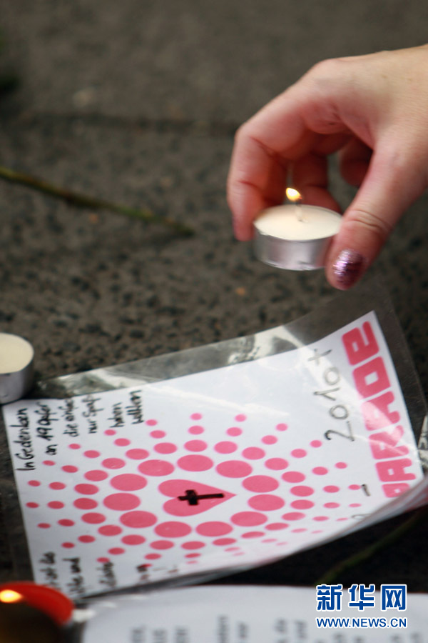 7月25日,一名当地居民在德国杜伊斯堡踩踏事件发生地附近摆放蜡烛悼念亡者。 7月24日,德国杜伊斯堡市在举行“爱的大游行”电子音乐狂欢节时发生踩踏事件。根据官方公布的数据,踩踏事件已造成包括1名女性中国公民在内的19人死亡、342人受伤。新华社记者罗欢欢摄
