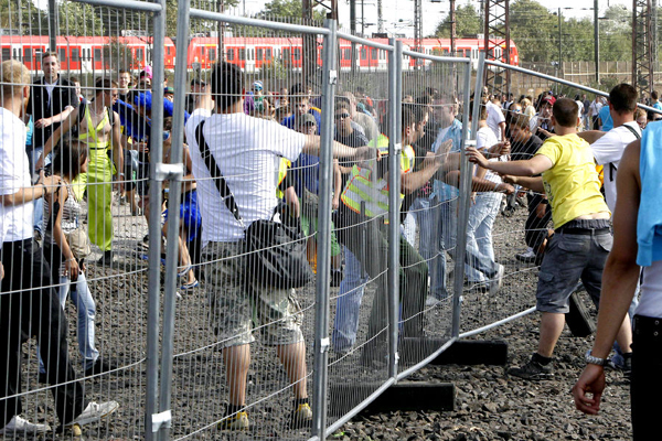 踩踏事故发生后,安保人员打开护栏让现场民众逃生。