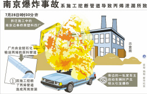 南京爆炸事故系施工挖断管道导致丙烯泄漏所致