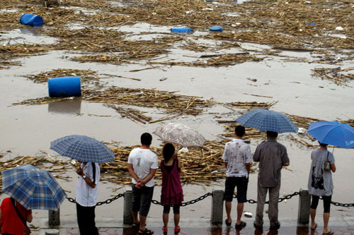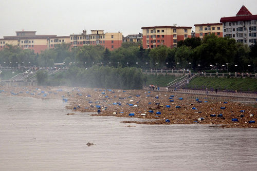 7月28日,松花江吉林市区段出现上千只化工用桶。>>>高清图集