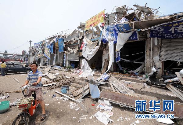 7月28日,位于爆炸现场公路对面的建筑物也遭损坏。新华社记者孙参摄