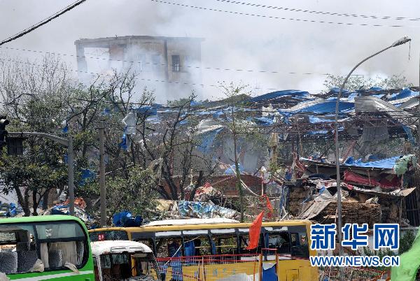 7月28日,爆炸现场附近的建筑物及公路上的汽车损毁严重。新华社记者孙参摄