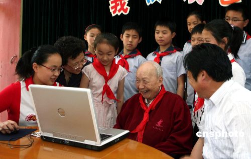 资料图:2007年5月14日,钱伟长第12次回到母校——江苏无锡荡口中心小学,受到师生们的欢迎。中新社发 顾祚维 摄