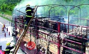 接到报警后,璧山消防中队赶到现场,30分钟将大火扑灭。货车装载的货柜架有易燃胶,很快被大火烧成光架架,司机估计损失数万元。