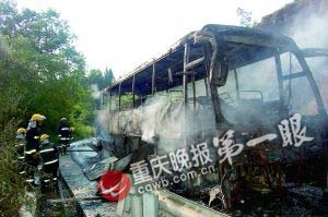 本报讯 前日下午,一辆由重庆主城开往丰都县城的定线大客车(渝G07787),行至垫江县杠家镇时突然发生自燃,整个车身烧成光架架。所幸疏散及时,26名驾乘人员全部安全逃生。