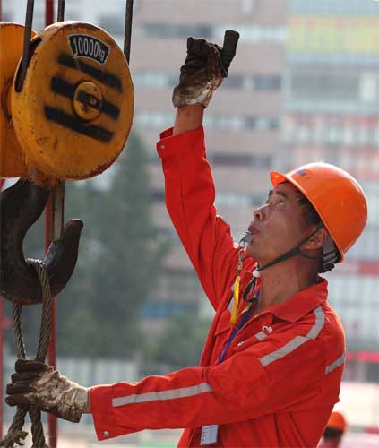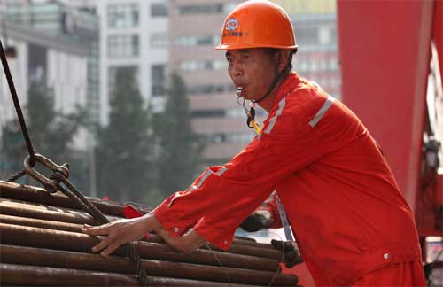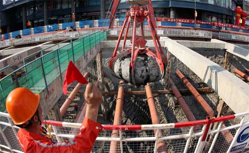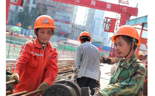 在轨道交通东门口站,中铁十三局施工工地上,工人们顶着烈日全力工作。