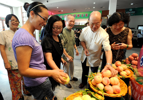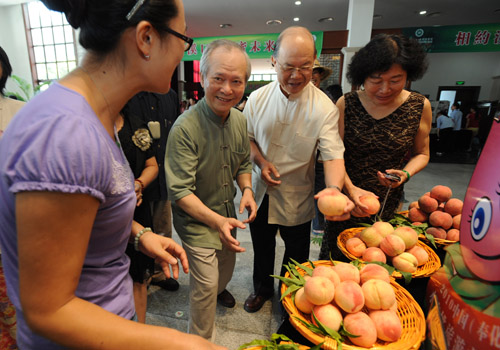 图为昨天上午参加2010中国(溪口)水蜜桃旅游文化节的台湾游客正在品赏出产于两岸的优质水蜜桃。