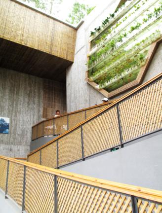 角窗、转廊、竹条,构筑了三维立体的视角,移步换景,各有不同的美感,一一呈现着宁波的山水风情。进入滕头馆中心,心地顿时被那片绿色所占领,眼前突然明亮透彻起来,这是一大片自然的绿色,也是城市生命的起源。绿色的水稻挺拔而茂盛,充满着无限的生机与活力,还散发着阵阵的稻香。一旁的高墙,本质着与外界的界限。在墙上爬满了绿色的藤叶,也是十分的清新绿色。而不时飘荡的烟雾水汽,弥漫着水蜜桃的香气,模糊了天与地,人间天堂的现实版油然而生。这里是上海负离子浓度最高的地方,天然的氧吧,纯净着每个到此参观者的身心。这里是宁波馆的核心,自然的天地,在城市的生活中显得非常的弥足珍贵。馆内派发的水蜜桃,清凉可口,一如甘泉,更加纯粹着自然的芳香与美好。每一在此的游人总会游于此,醉于此,享受着自然的恩赐!