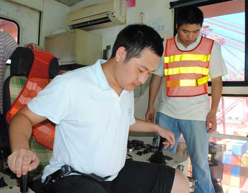 9点20分,货船准时靠岸,笔者跟随竺士杰登上了9号桥吊。搭乘升降梯上到了42米高的桥吊驾驶室,驾驶室的地板一半是实心铁板,一半却是玻璃,站在里头往下看,犹如悬空一般,这时整个空间开始剧烈晃动,回头一看,原来是竺士杰的徒弟小余正在启动机器。他左手柄控制速度,右手柄控起落,放下吊具—起吊—回移—安放到集卡车上,伴着电机轰鸣声,多个动作一气呵成。“不要紧张,你的其他动作都很到位,就是在档位转换上还欠妥当,有点吃不准,这就需要你果断的判断力,确定吊具位置后,立刻做出反应。”竺士杰对小余提出了更高的要求。小余已经在这个岗位上做了4年,但对于桥吊操作工而言却还只能算是个新手。