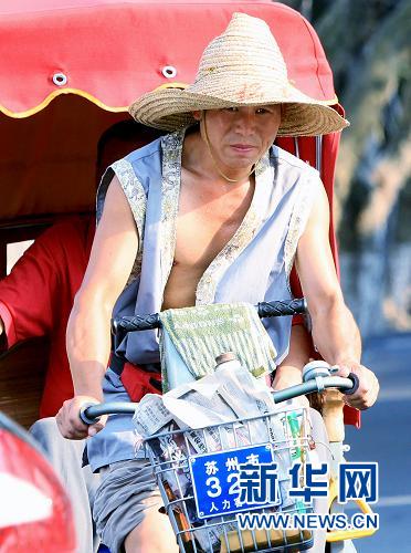 8月2日,一名三轮车夫顶着高温烈日在苏州街头载客骑行。当日,江苏苏州最高气温从前一天的38摄氏度攀升至38.9摄氏度,苏州市气象台继续发布高温橙色预警信号。连日来,苏州骄阳似火,高温持续。新华社发(王建中 摄)