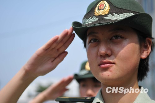 7月28日,在烈日下执勤的武警边防女兵们一脸汗水。高温酷暑季节,武警浙江省台州边防支队的女兵们仍坚守在执勤一线,以辛劳的付出迎接“八一”建军节的到来。 中新社发 (郏策) 摄