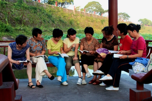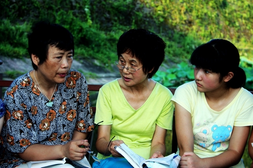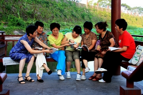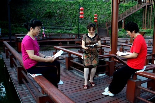 镇海有一支由七位55至61岁老年妇女组织成的‘婆婆英语沙龙’,她们每周六早上5:30点在后海塘外的仰止亭或朗诵、或阅读,互帮互学,为迎接世博会的来临,已经坚持一年多时间了,目前她们都已能简单的会话。8月1日,为参加世博“宁波特别日”活动,特意请来蛟川书院的徐同学来辅导。陈永忠摄