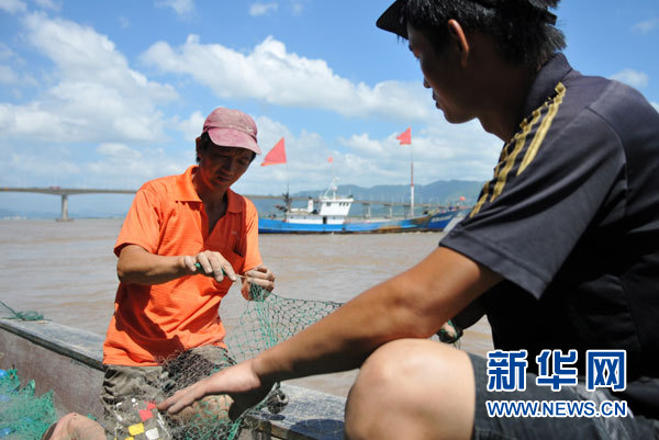 8月9日,在浙江台州海门港某码头,渔民们趁渔船回港避风时机抓紧补网。 今年第4号热带风暴“电母”于8月8日晚在台湾以东洋面上生成,并以每小时20公里左右的速度向偏北方向移动,9日上午风力已达到9级。受其影响,未来3天,我国东海东部及黄海东南部海域将有较大风雨,在附近海域航行、作业的船舶纷纷回港避风。 新华社发(郏策 摄)
