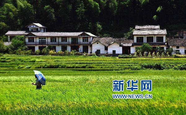 7月30日,一位生活在湖南崀山丹霞地貌风景区的居民从新居前走过。此次,中国把全面展示丹霞地貌形成演化过程的贵州赤水等6个丹霞地貌风景区“捆绑”申报自然遗产新华社记者赵众志摄