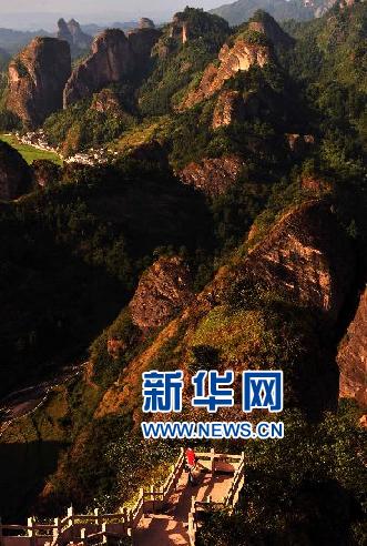 7月30日黄昏,一位登山爱好者在湖南崀山“骆驼峰”丹霞地貌风景区游览。