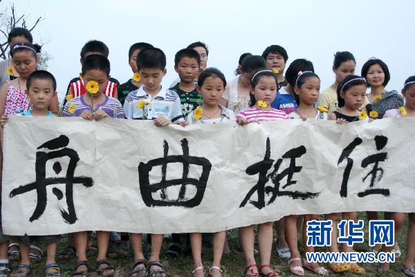 8月15日,人们在安徽省含山县得胜河边哀悼舟曲特大山洪泥石流遇难同胞。为表达全国各族人民对甘肃舟曲特大山洪泥石流遇难同胞的深切哀悼,国务院决定,8月15日举行全国哀悼活动,全国和驻外使领馆下半旗志哀,并停止公共娱乐活动。新华社发(程千俊 摄)