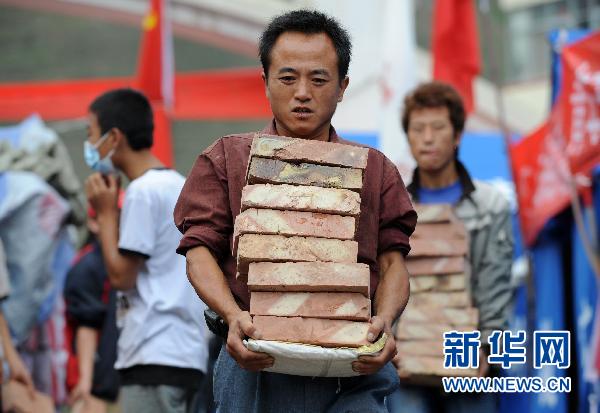 8月14日,志愿者在舟曲县三中受灾群众安置点搬运砖块。舟曲特大山洪泥石流灾害发生后,当地群众、正在放暑假的中学生、大学生组成的青年志愿者服务队,每天从事着繁重的救灾物资搬运、生活垃圾清理等抢险救灾活动。 新华社记者 王鹏 摄