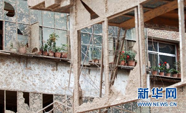 8月14日,甘肃舟曲,泥石流冲刷过的一户居民楼外,几盆花儿鲜艳夺目。甘肃舟曲特大山洪泥石流灾害发生后,一盆盆“幸存”下来的鲜花在废墟上盛开,鲜艳的花朵在一片土色中尤为夺目,似乎昭示着生命的生生不息。新华社记者张宏祥摄