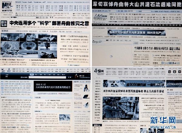8月15日零时拍摄的新华网、人民网、腾讯网和中国网的主页(拼版照片)。自当日零时起,人民网、新华网等各大网站统一将主页色调全部变成肃穆的黑白灰色,以示对舟曲泥石流中遇难同胞的深切哀悼。为表达全国各族人民对甘肃舟曲特大山洪泥石流遇难同胞的深切哀悼,国务院决定,8月15日举行全国哀悼活动,全国和驻外使领馆下半旗志哀,停止公共娱乐活动。新华社记者燕雁摄