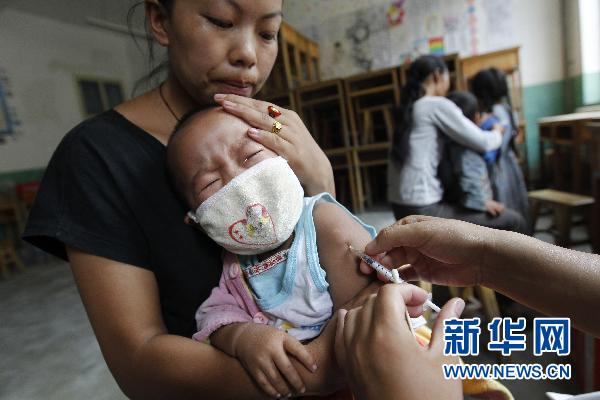 8月18日,在甘肃舟曲县城独立中学受灾群众安置点,医务人员在为幼儿接种甲肝疫苗。鉴于舟曲灾区目前的卫生和疾病预防形势,甘肃省、甘南藏族自治州、舟曲县三级疾控中心自8月16日开始,为灾区1岁半至6岁的幼儿大面积接种甲肝疫苗,防止甲肝疾病的发生。截至8月18日12时,已有约500名幼儿接种了甲肝疫苗。新华社记者 任正来 摄