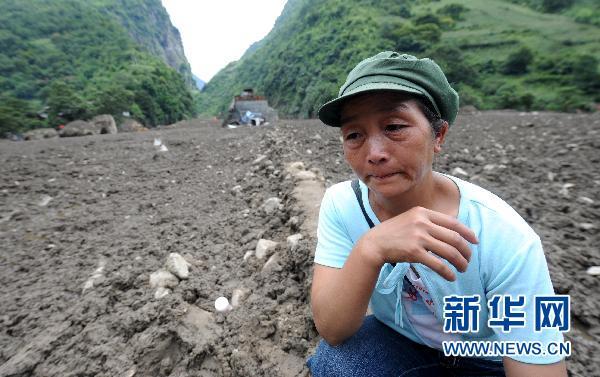8月19日,傈僳族妇女李成丽在云南贡山普拉底乡的泥石流灾害现场抽泣,她的丈夫在这次灾害中失踪。 新华社记者 蔺以光 摄
