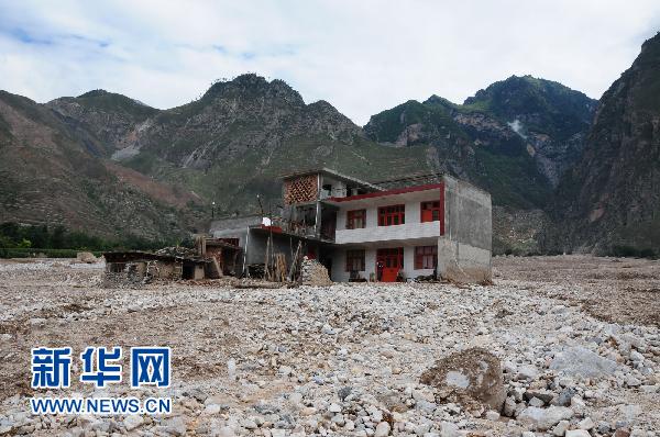 这是8月21日拍摄的仍然矗立的薛明保的房子。薛明保的房子是舟曲特大山洪泥石流灾害中两栋地处泥石流中央却未被摧毁的房子之一,被称为“舟曲最牛楼房”。新华社记者 朱国亮 摄