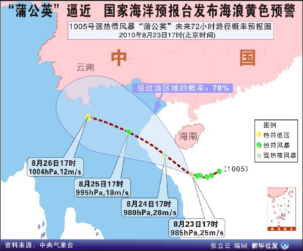 新华网北京8月23日电(记者姚润丰)据国家防汛抗旱总指挥部监测,今年第5号热带风暴“蒲公英”23日14时中心位于海南省三亚市偏东大约220公里的南海中部海面上,中心附近最大风力9级(23米/秒)。预计风暴中心将以每小时15公里左右的速度向西北方向移动,并有可能于23日夜间到24日上午擦过海南南部沿海,也有可能登陆。