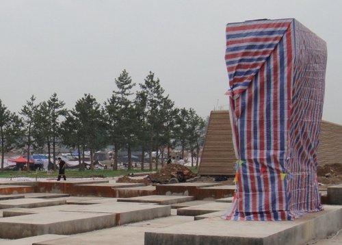 纪大爷带着记者来到公园南面的崇明门,广场中央立着两个被塑料纸包起来的雕塑,透过塑料纸的缝隙可以看到,里面是铁锈色的钢板,钢板中间是一面红色的城门,纪大爷说,这种铁锈色的钢板是从德国进口的,这样的雕塑本来有5个,现在拆得只剩下两个。工人告诉他,一年时间才建好的雕塑,光拆除费就用了至少28万。