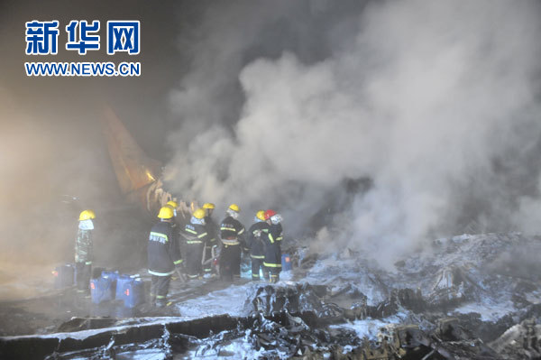 8月25日凌晨,救援人员在失事飞机残骸边开展救援工作。新华社发(王志富摄)
