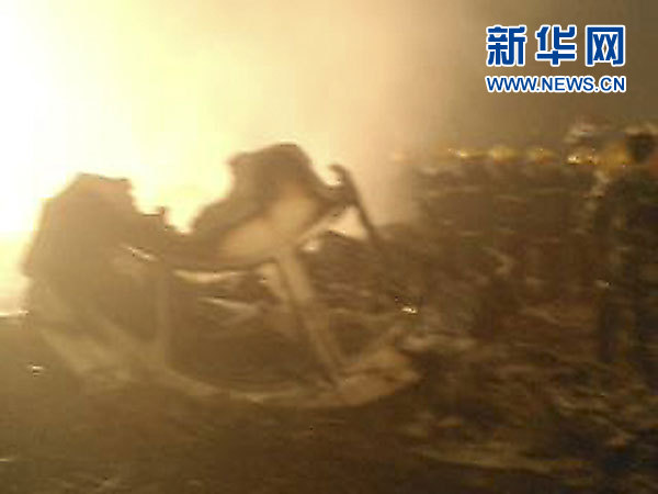 8月25日凌晨,救援人员在飞机残骸边展开救援工作(手机拍摄)。新华社发(李广福 摄)