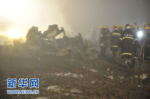 8月25日凌晨,救援人员在失事飞机残骸边开展救援工作。新华社发(王志富摄)