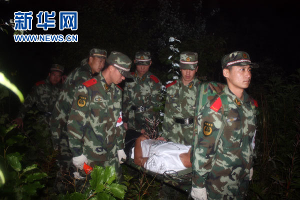 8月24日晚,伊春森警官兵紧急将一名坠机事件生还者送医救治。新华社发