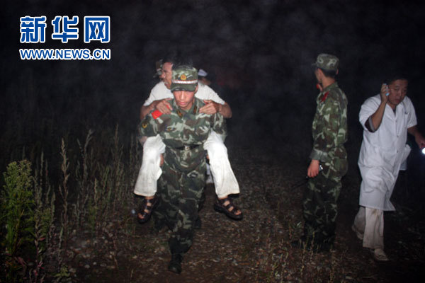 8月24日晚,伊春森警官兵背着一名坠机生还者送医救治。新华社发