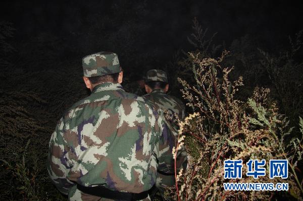 8月25日凌晨,伊春边防支队官兵在飞机失事现场林中展开拉网式搜救,寻找幸存者。新华社发(李广福 摄)