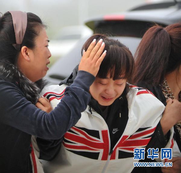 8月25日,一位在伊春空难中失去亲人的家属(中)在机场门前悲痛不已。新华社记者 李勇摄