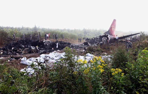 8月25日,黑龙江伊春飞机失事现场,遇难者的遗体已经收集到了一起。