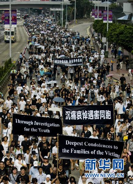 8月29日,游行者打出“沉痛哀悼遇害同胞”等标语。新华社记者吕小炜摄