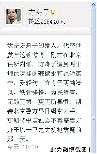 “我是方舟子的爱人,代替他发布这条微博。刚才在北京住所附近,方舟子遭到两个埋伏歹徒的辣椒水和铁锤袭击,受轻伤。方舟子两袖清风,铁骨铮铮,为民除害,无怨无悔,更无所畏惧。期待北京警方早日缉拿凶手,更期待中国社会不再需要方舟子以一己之力抗拒群魔的那一天。”昨日傍晚6时19分,由方舟子微博用户名发出的这条微博,在网络上可谓石破天惊。